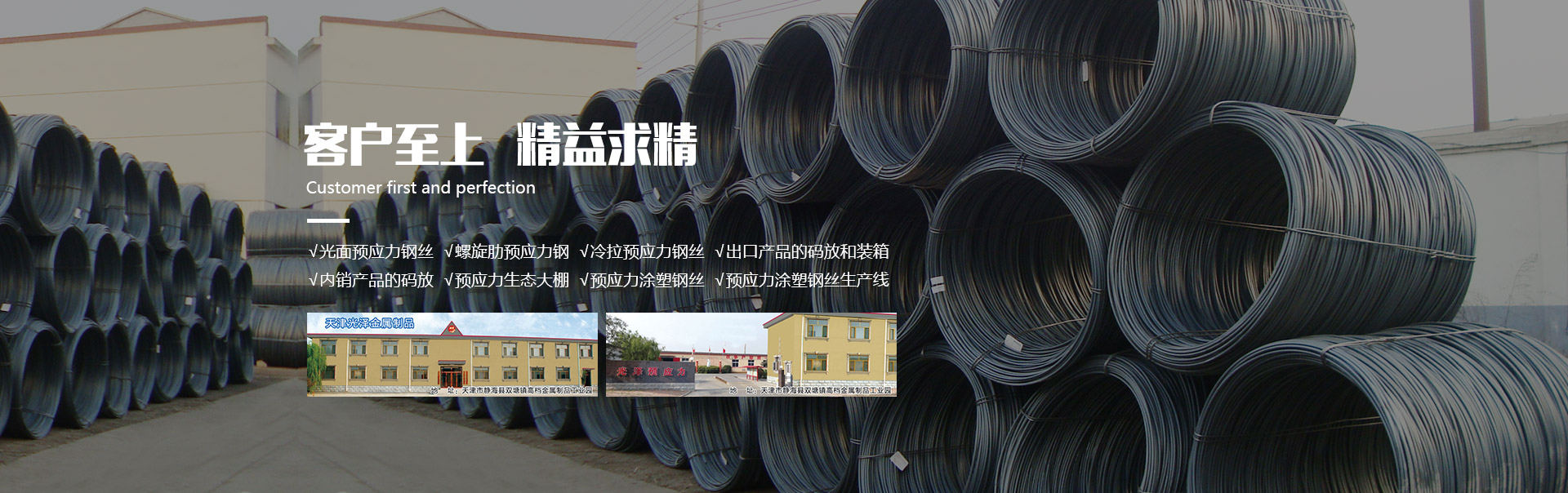 公司始建于1996年8月1日,位于渤海之濱,坐落于天津市區西南40公里處的南運河東岸,臨近天津機場和塘沽港口。公司占地面積3萬平方米,兩個生產廠區,總資產3000萬元。主要生產預應力鋼絲,冷拔鋼絲,農用大棚鋼絲等產品。配有全套的污水處理設施。排放達到國家標準,肩負起了企業保護自然環境的責任。年生產能力十萬噸。是全國專業生產各種規格型號預應力鋼絲的知名企業。 公司技術力量雄厚、設備先進、經驗豐富、檢測手段完備。公司在2003年就通過了認監委認證的中國冶金質量體系ISO9001:2000質量體系認證。我公司以優質的產品和良好的信譽及服務,贏得了國內外用戶的普遍稱贊。 公司生產的管道用冷拉鋼絲Φ4.0mm-Φ7.0mm應用于南水北調、東西部輸水及全國各地區輸水工程達十幾萬噸。 公司生產的Φ2.6mm-Φ10.0mm預應力混凝土用螺旋肋及光面鋼絲除在國內銷售外,還出口伊朗、越南、土耳其、菲律賓、墨西哥、加拿大、埃及等國家。 公司生產的各種規格涂塑鋼絲,應用于種植蔬菜大棚、農林防護、公園圍欄。